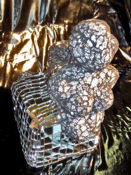 Höhe 47 x 28 x 20 cm (Höhe x Breite x Tiefe) Herstellungsjahr 2014, Material: Skulptur aus Ton modelliert, danach zementiert und mit Spiegelsplitter belegt, ohne Sockel, der Boden der Skulptur ist überzogen mit Kork.